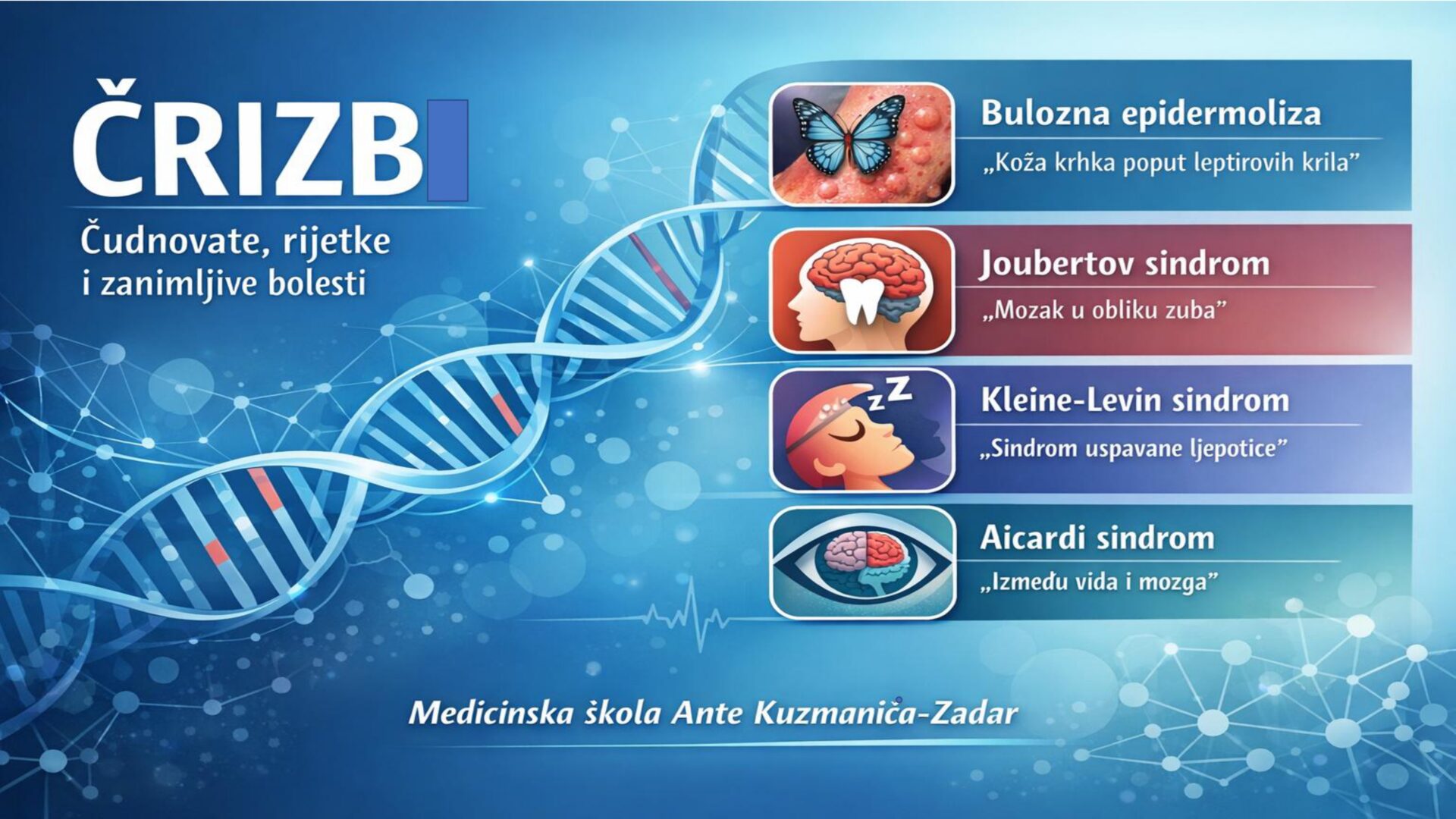Učenici 5. a razreda Medicinske škole Ante Kuzmanića u Zadru tijekom ove školske godine sudjeluju u projektu ČRIZB – Čudnovate, rijetke i zanimljive bolesti.